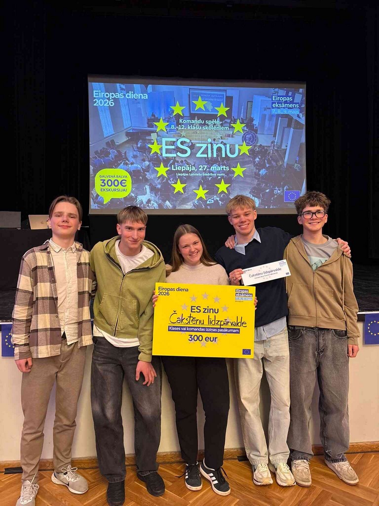 27.martā mūsu Skolēnu līdzpārvaldes komanda “Čakstēnu līdzpārvalde” piedalījās iedvesmojošā komandu spēlē “ES zinu” un ieguva 1.vietu. Spēles laikā Liepājas skolu jaunieši pārbaudīja savas zināšanas par Eiropas Savienību, gatavojoties Eiropas eksāmenam 2026.