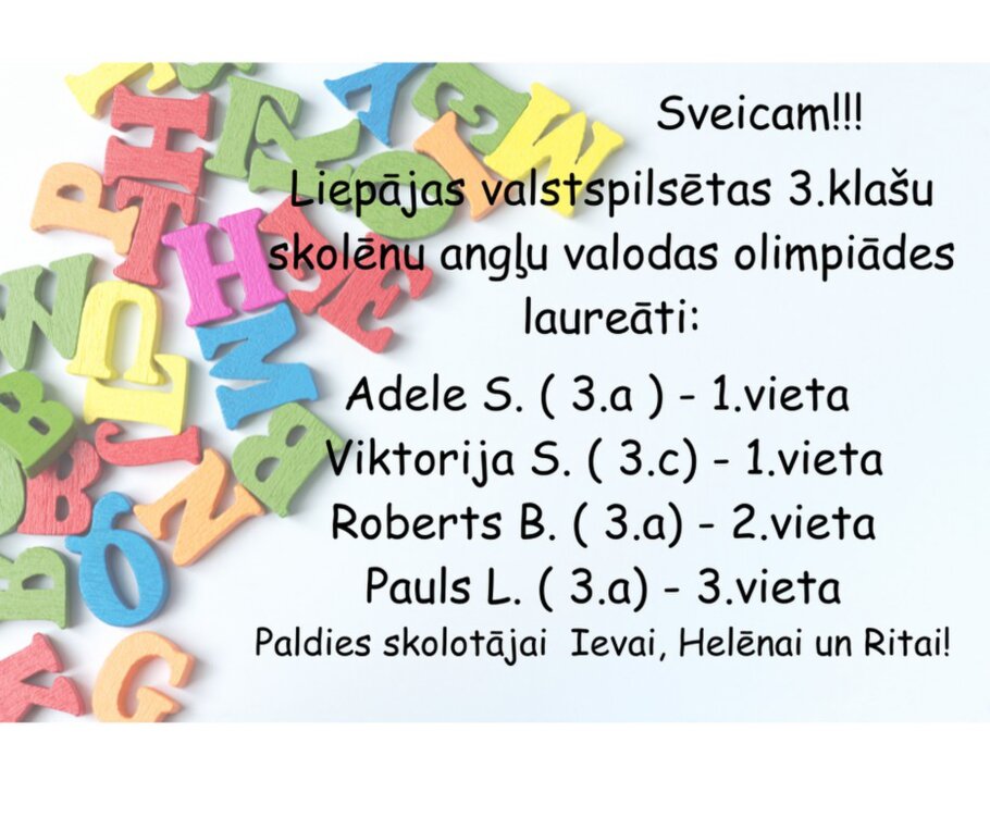Aprīlī noslēdzas  1.-3.klašu skolēnu olimpiāžu laiks. Ikviens skolēns piekrīt tam, ka angļu valodu ir ļoti svarīgi zināt, jo vairāk kā 60 valstīs tā ir oficiālā valsts valoda, bet saziņa ar cilvēkiem ārpus Latvijas  ir aktuāla jebkurā vecumposmā. Mūsu četru 3.klašu skolēnu sasniegumi  angļu valodas olimpiādē priecē gan skolotājus, gan pašus dalībniekus un viņu vecākus. Lepojamies ar  Adeles (1.vieta), Viktorijas ( 1.vieta), Roberta ( 2.vieta ) un Paula ( 3.vieta) iegūtajām godalgotajām vietām! Paldies skolotājām un arī vecākiem par atbalstu!